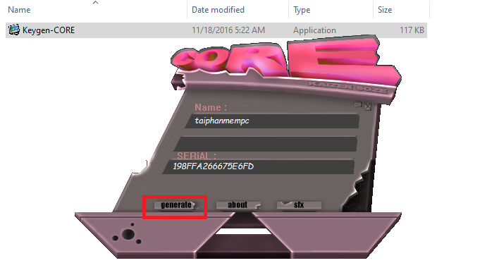 - Vào thư mục Keygen chạy path Keygen, nhập tên vào ô name sau đó bấm nút Generate để lấy key bản quyền